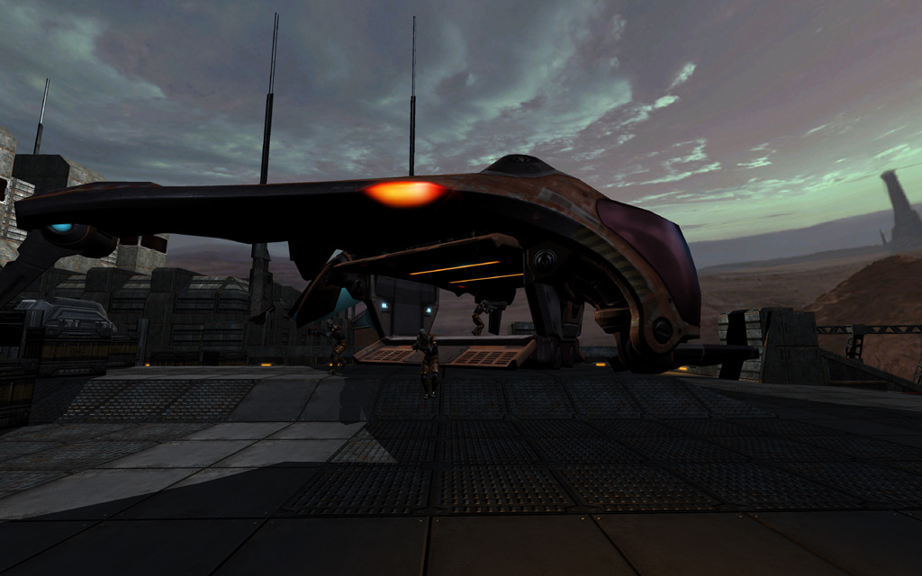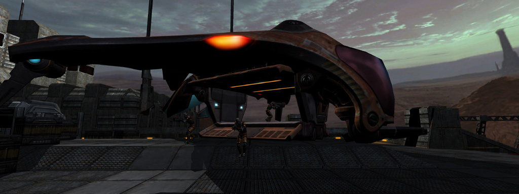 Another late-game addition was the Strogg Dropship. Unlike the Strogg Flyer before it, the dropship did come with a properly scaled mesh as well as landing and take off animations, but we needed a general-purpose delivery system.