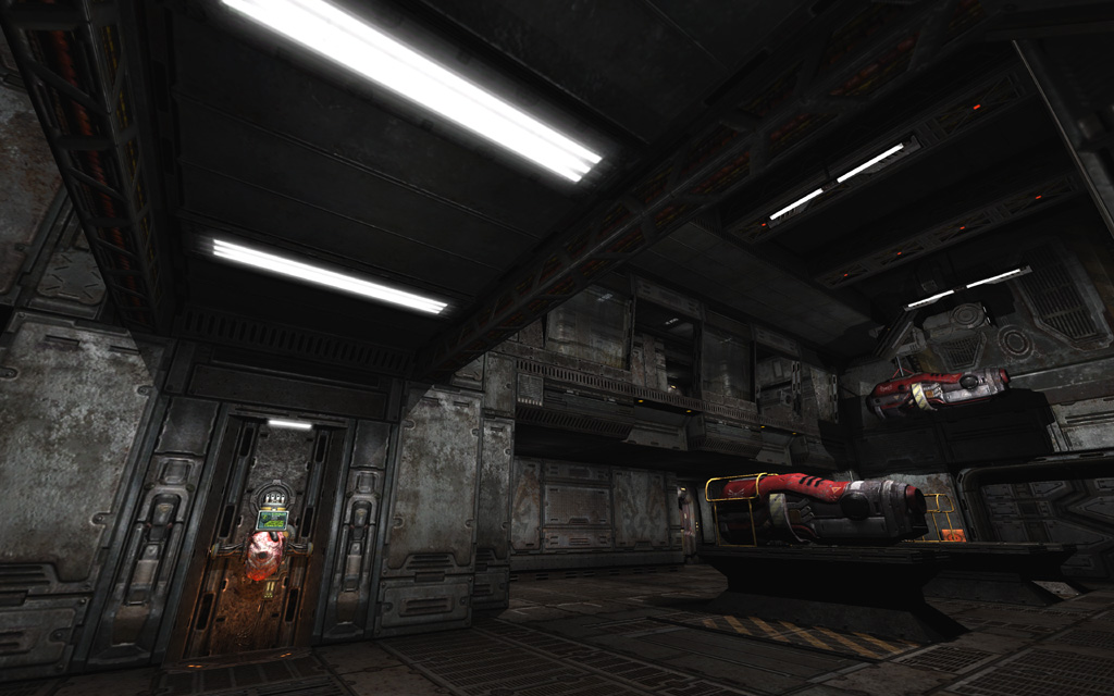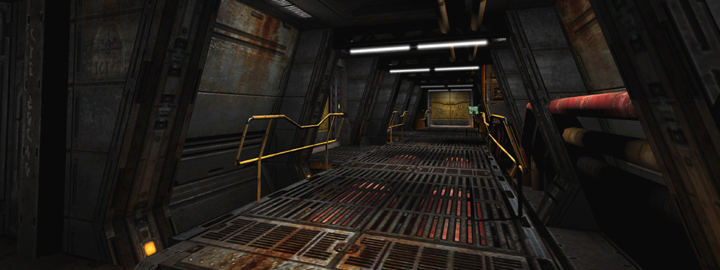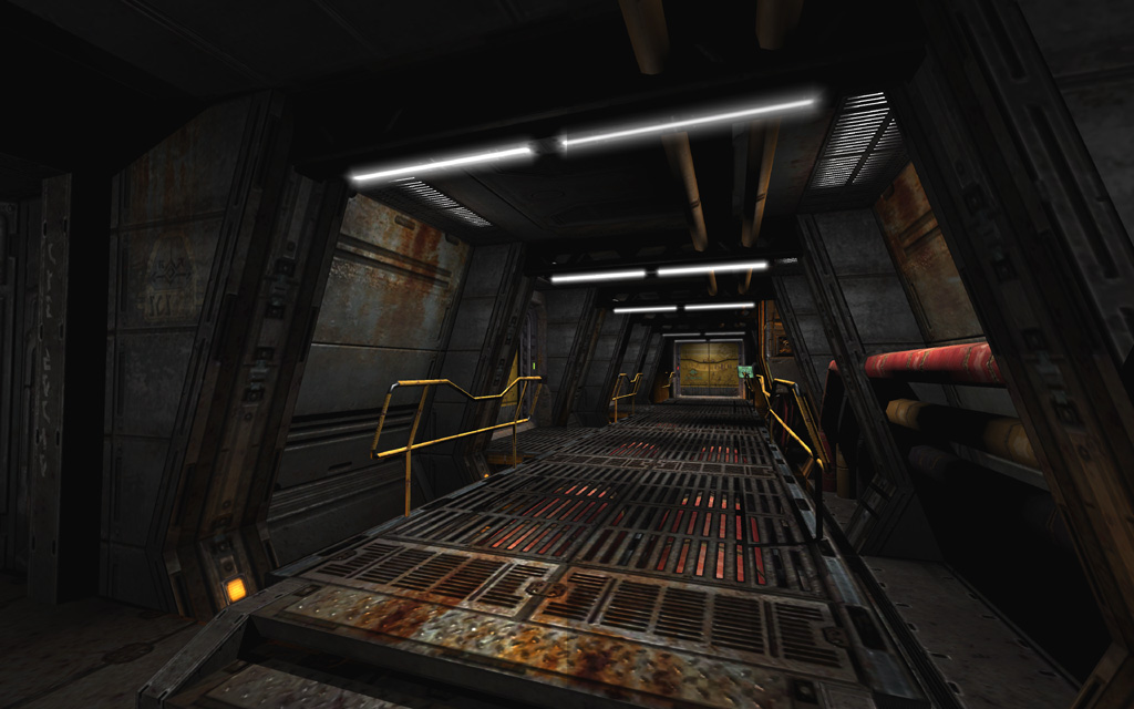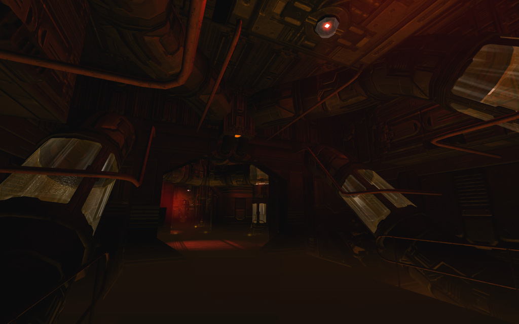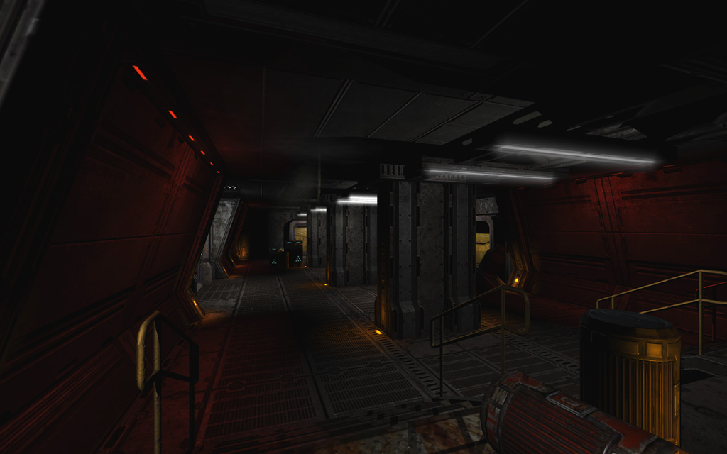 To play up the 'out of commission' feel for the first pass through the level, I picked a deep yellowish base tone highlighted with spinning red emergency lights and flashing yellow accent lights on the floor. To further ground the level's colors, I added a thin yellow ground fog to simulate haze illuminated by the floor lights, and also gave every piece of glass a subtle dark yellow tint that blended nicely with the texture's normal map and cubemap.