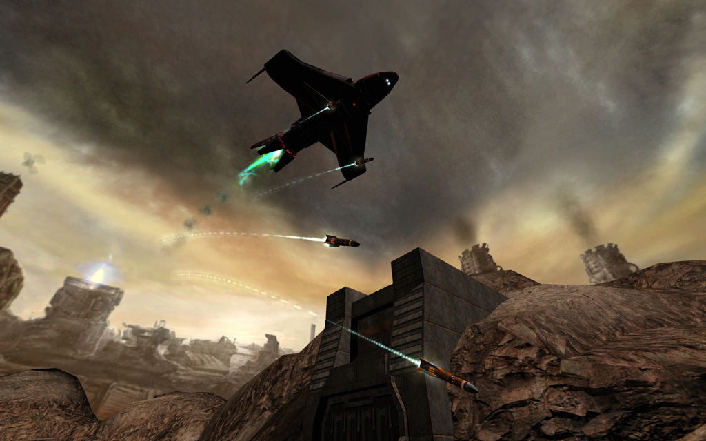 I started with the correctly-scaled static mesh version of the Flyer (first seen in Interior Hangar), and scripted a set of them on a series of spline paths to fly strafing runs over the player in the walker. Next, I added a new projectile1 that I launched from positions attached to each wing. These projectiles are not homing projectiles, but at the moment they are fired select a target position extrapolated from the player's current movement vector, ensuring enough prediction to be dangerous if players don't move to evade.