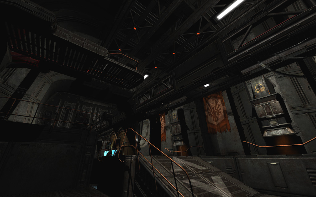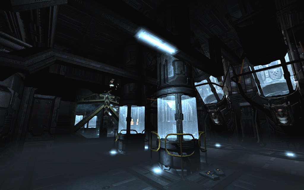 Fellow designer Corey Peters had just completed his own lighting pass on the main Data Storage level. My first instinct was to emulate his settings for consistency, but lead designer Jim Hughes encouraged me to pursue a new lighting style that would be unique to this level.