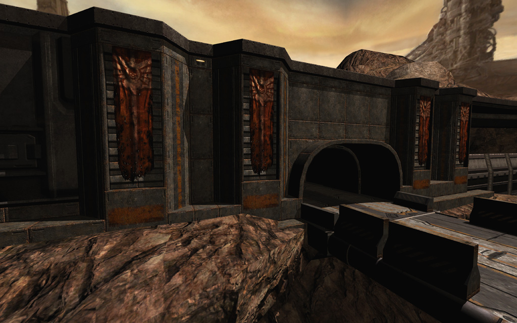MCC Landing Site bridges the gap between the Strogg Hangars and the first briefing aboard the Marines' command ship, the Hannibal. Most of the geometry of this level is merged from the levels preceding it and following it; the level starts with a non-combat section in the now Marine-controlled Hangar Perimeter, then transitions back to Air Defense Trenches (Corey Peters), which itself incorporates geometry from the level Convoy that follows (Mike Renner). Of the content unique to this level, I was responsible for building and scripting the encounter space under the Strogg air defense cannon, while Roger Cordes constructed the open terrain landing site at the end of the level.