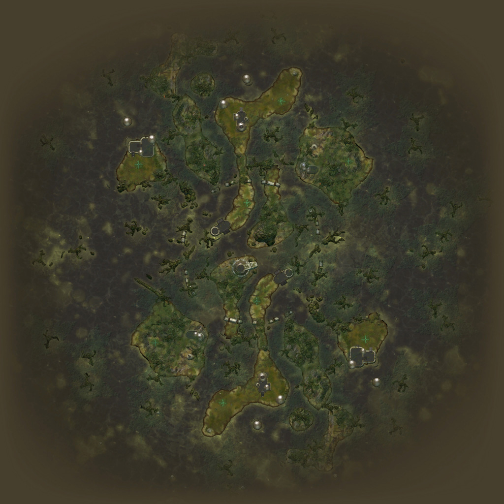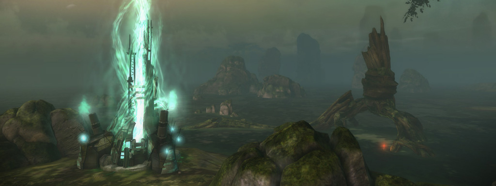 One of my favorite touches in the Cypress skydomes was a cluster of rock pillars painted into the back of the skydome. This always gave me images of what a level might look like set there, and invoked immediate thoughts of Warhawk's classic level Archipelago. In the absence of doing such a level, I used stacks of the rock meshes we already have to emulate that style at Glade's outer boundary, giving the appearance of rock monoliths gradually rising from the swamp.