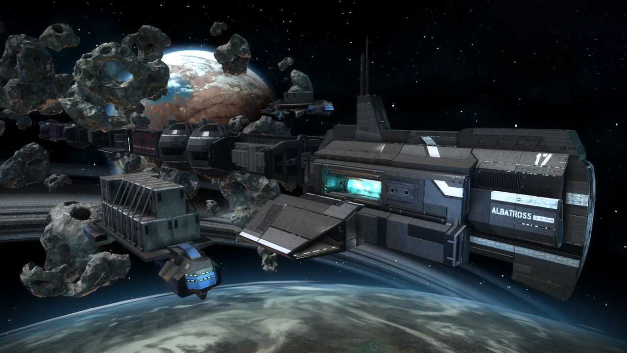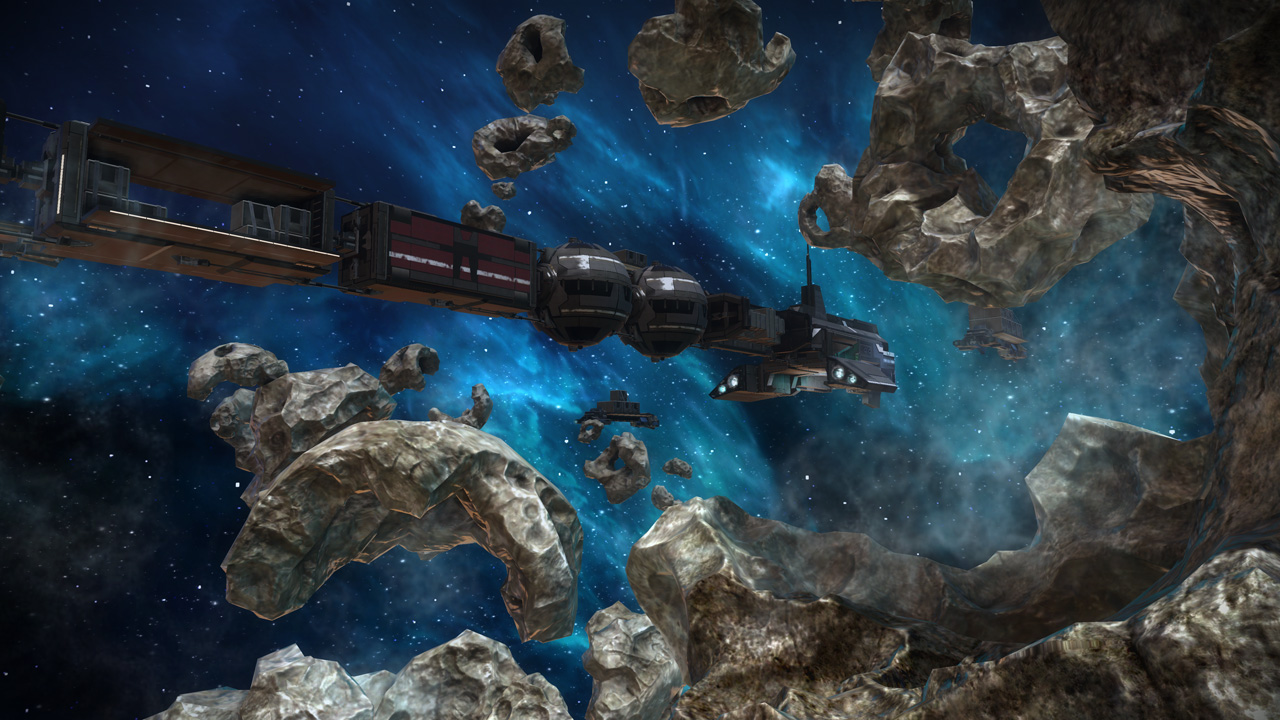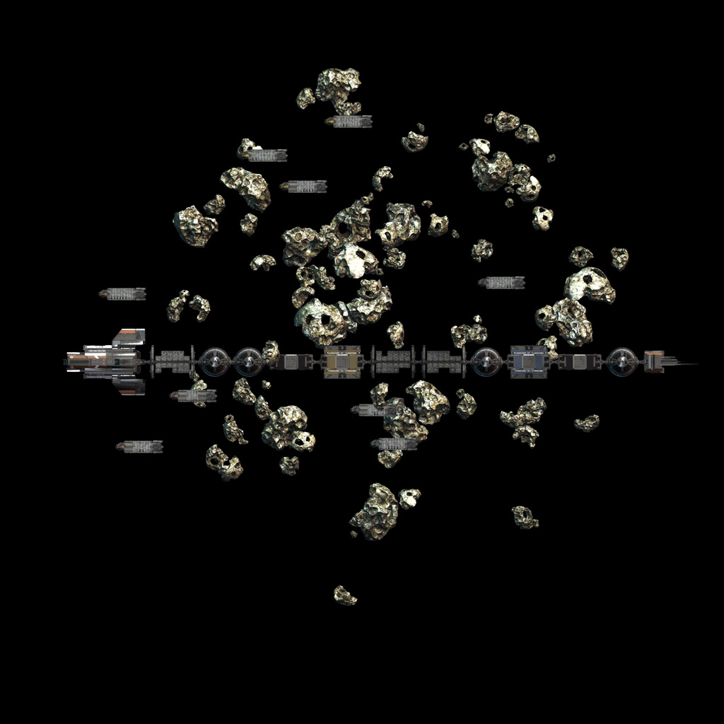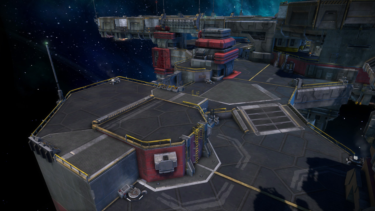 Immediately after Starhawk shipped, I decided to remedy that. I started by stretching the giant "space train" across the middle of the level, then added nearby clusters of freighters. Once these were in place, I went all-out on the asteroid field motif, with emphasis on creating clusters to steer players towards pickups and encourage certain chase routes. Flotilla is by far the largest level in the game, making it ideal for hectic dogfights on packed servers.