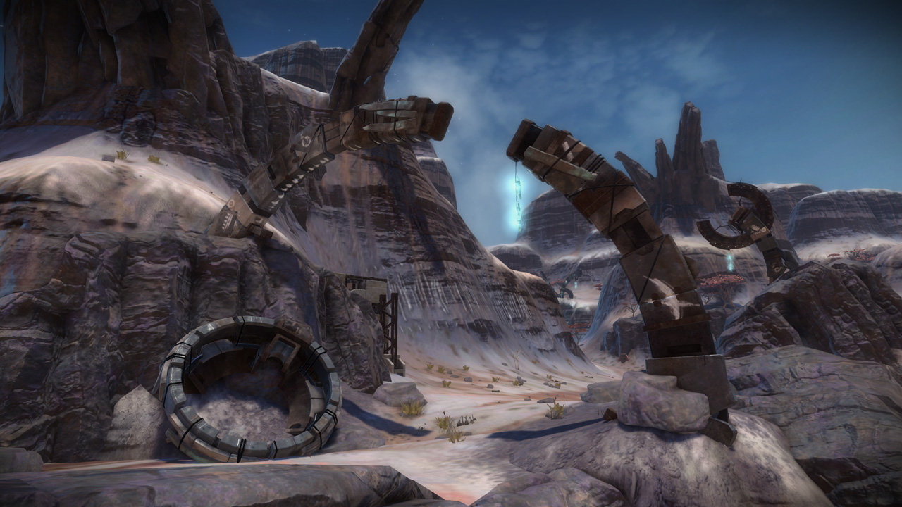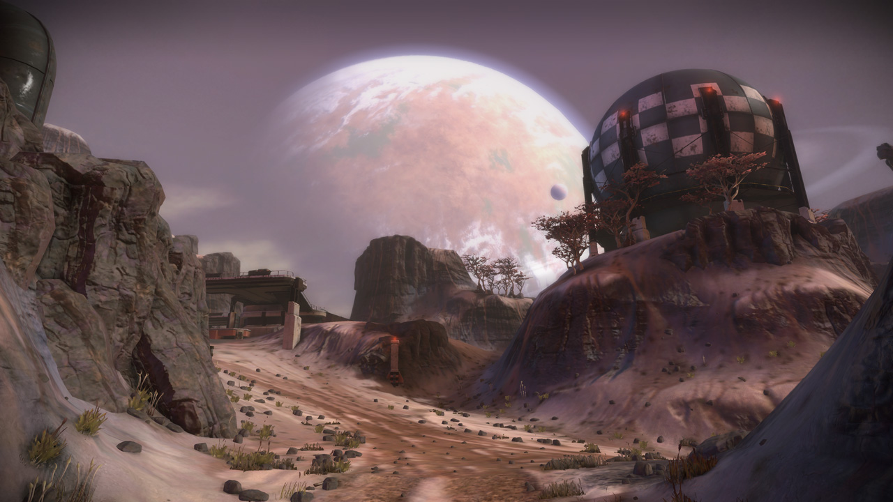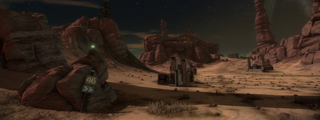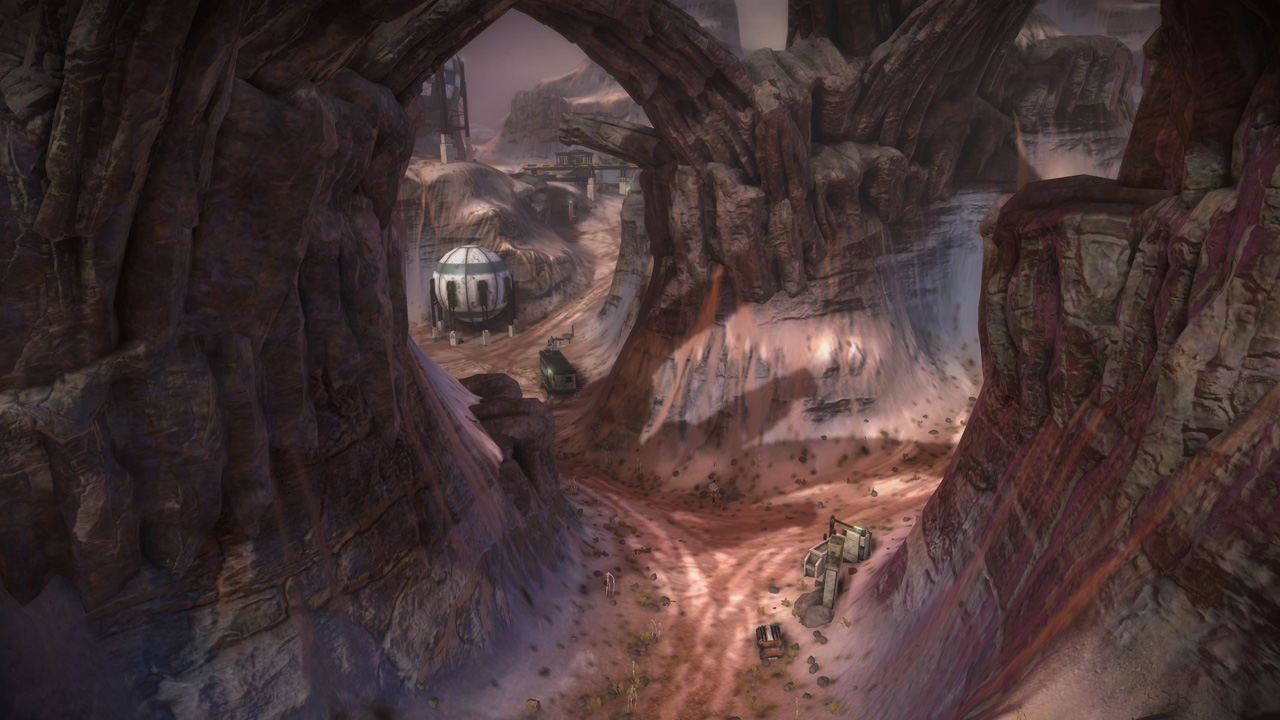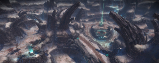 My intention had always been that the east ridge would feature heavier man-made structures compared to more natural low-lying areas to the west. I temporarily borrowed the "Ballard's Crossing" space elevator from the single player campaign to provide a visual anchor to the top of the central plateau, but this never quite came together as strongly as I'd hoped.
