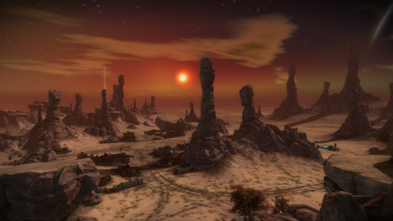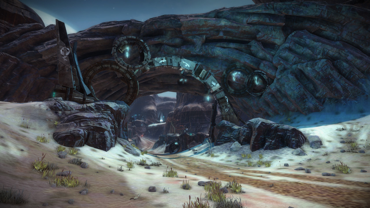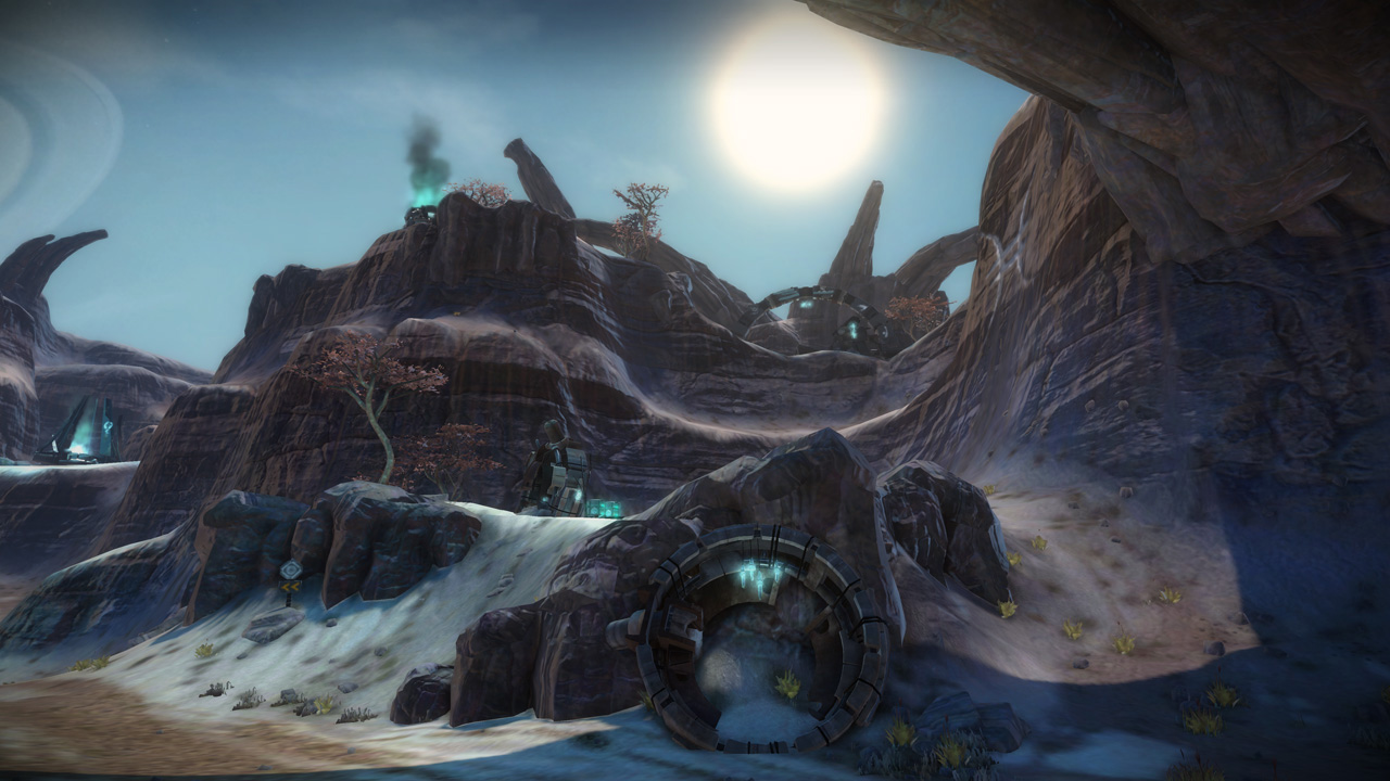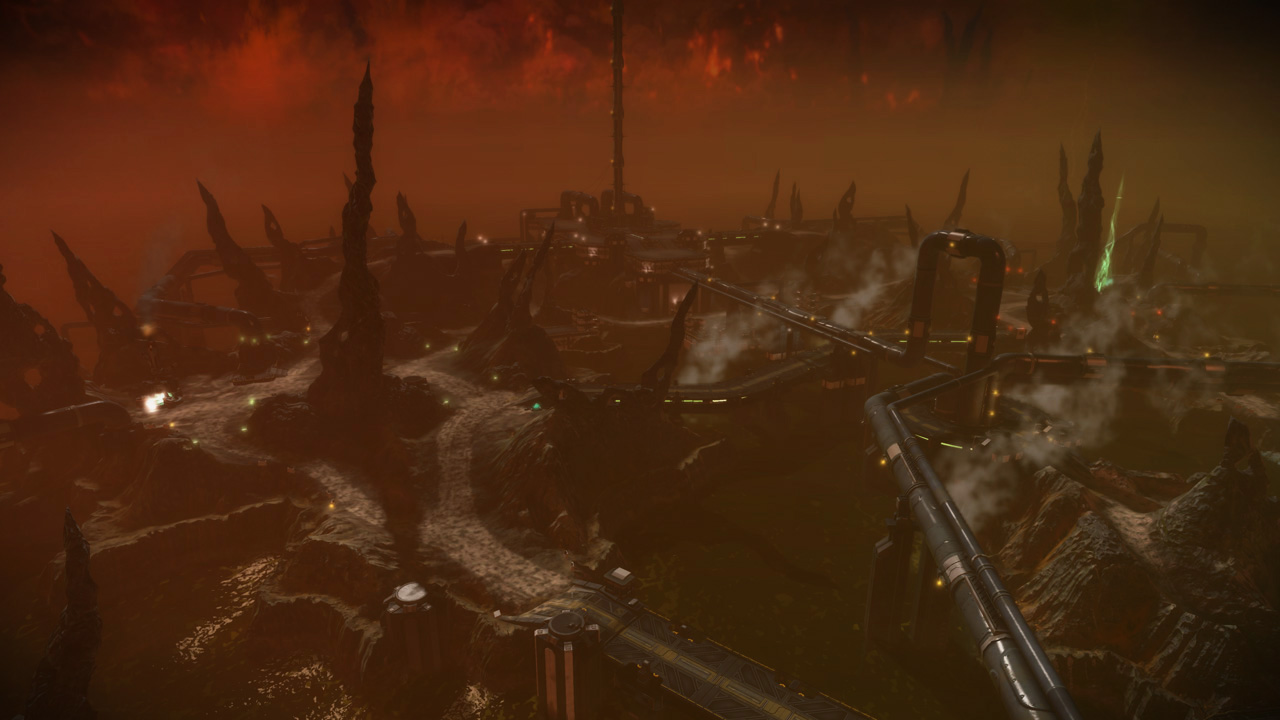 My intention had always been that the east ridge would feature heavier man-made structures compared to more natural low-lying areas to the west. I temporarily borrowed the "Ballard's Crossing" space elevator from the single player campaign to provide a visual anchor to the top of the central plateau, but this never quite came together as strongly as I'd hoped.