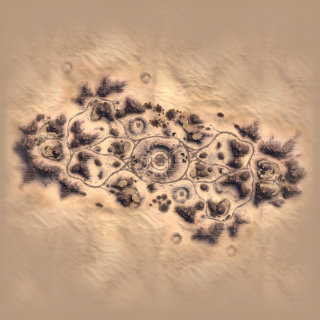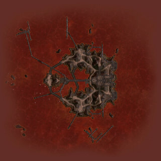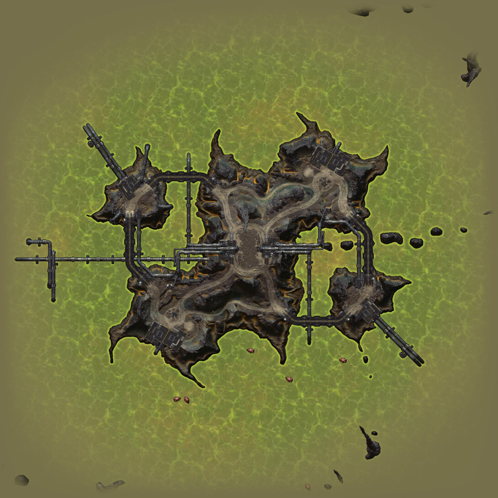 Where Hollow used flat terrain islands, Fracture's massive islands are all rotated off-kilter, adding extra challenge to developing the World Machine layout. To offset this, I used the same approach I used on Hollow to generate the cracked look and instead created large outcroppings sloped such that they would be roughly "flat" when applied to the island as placed in-game. Both teams' bases sit on the edge of massive outcrops at either end of the map, creating an imposing approach from the bottom and once again resulting in impressive vehicle jumps on the way out.