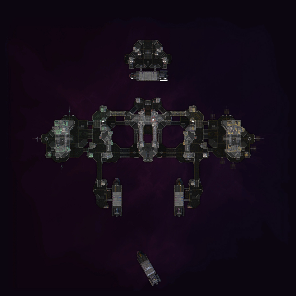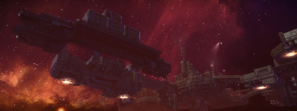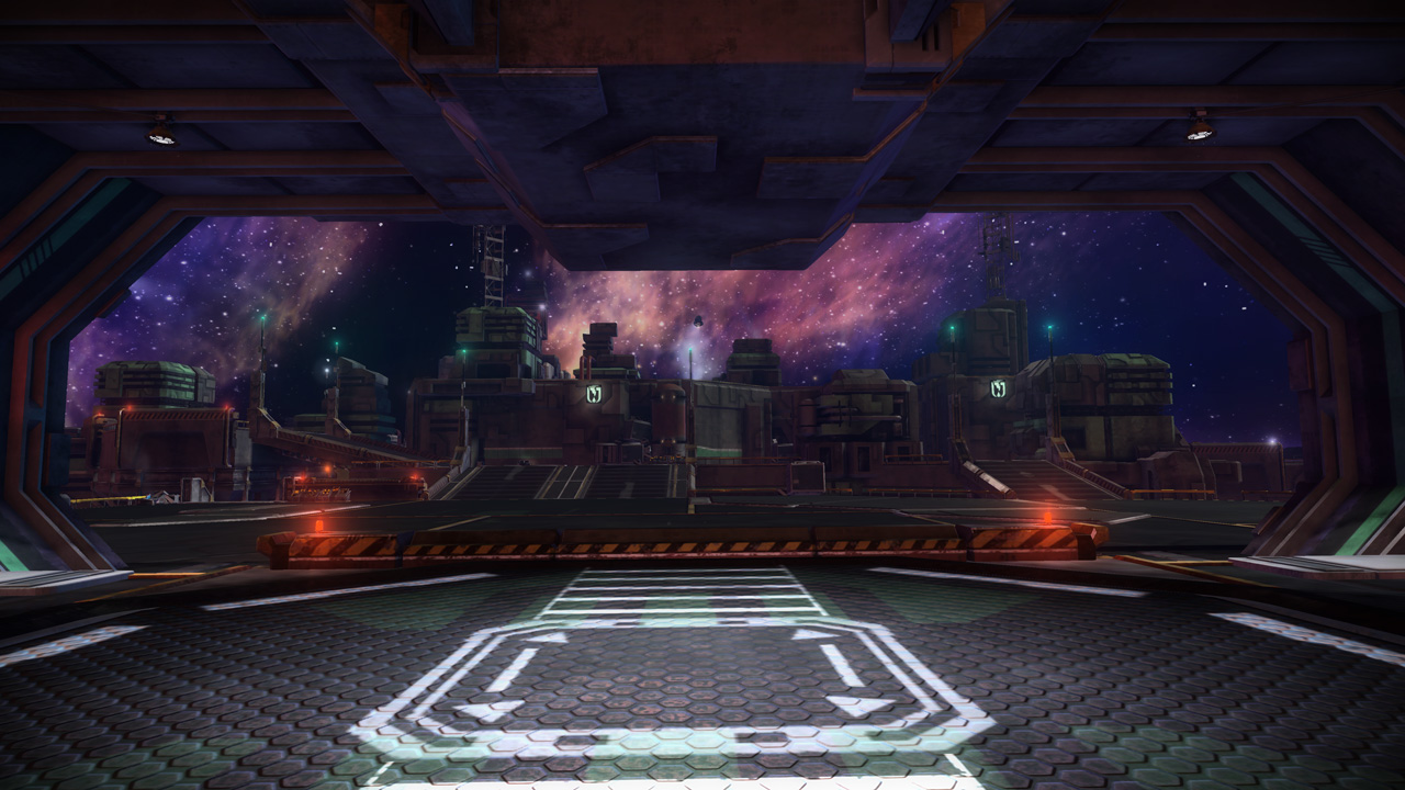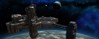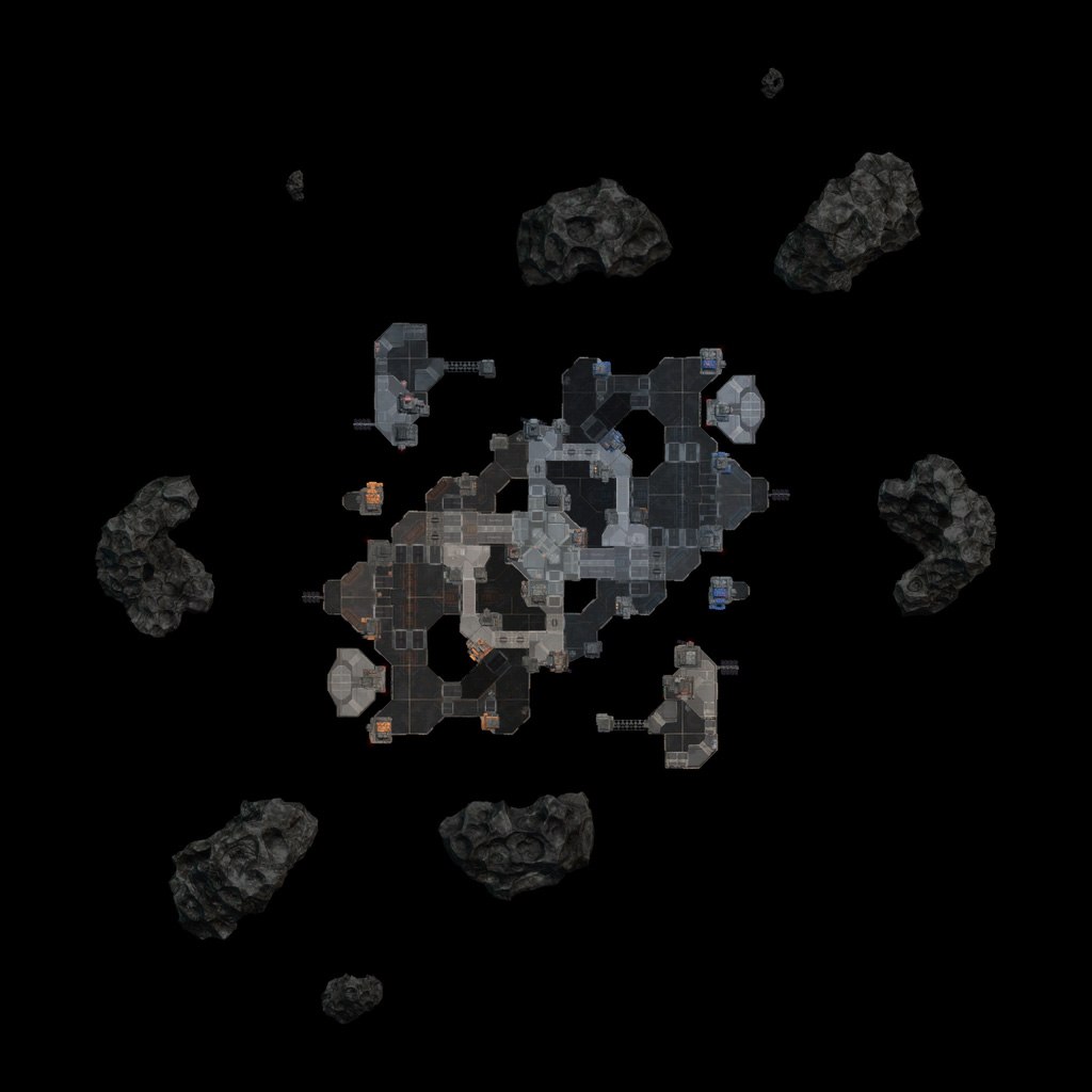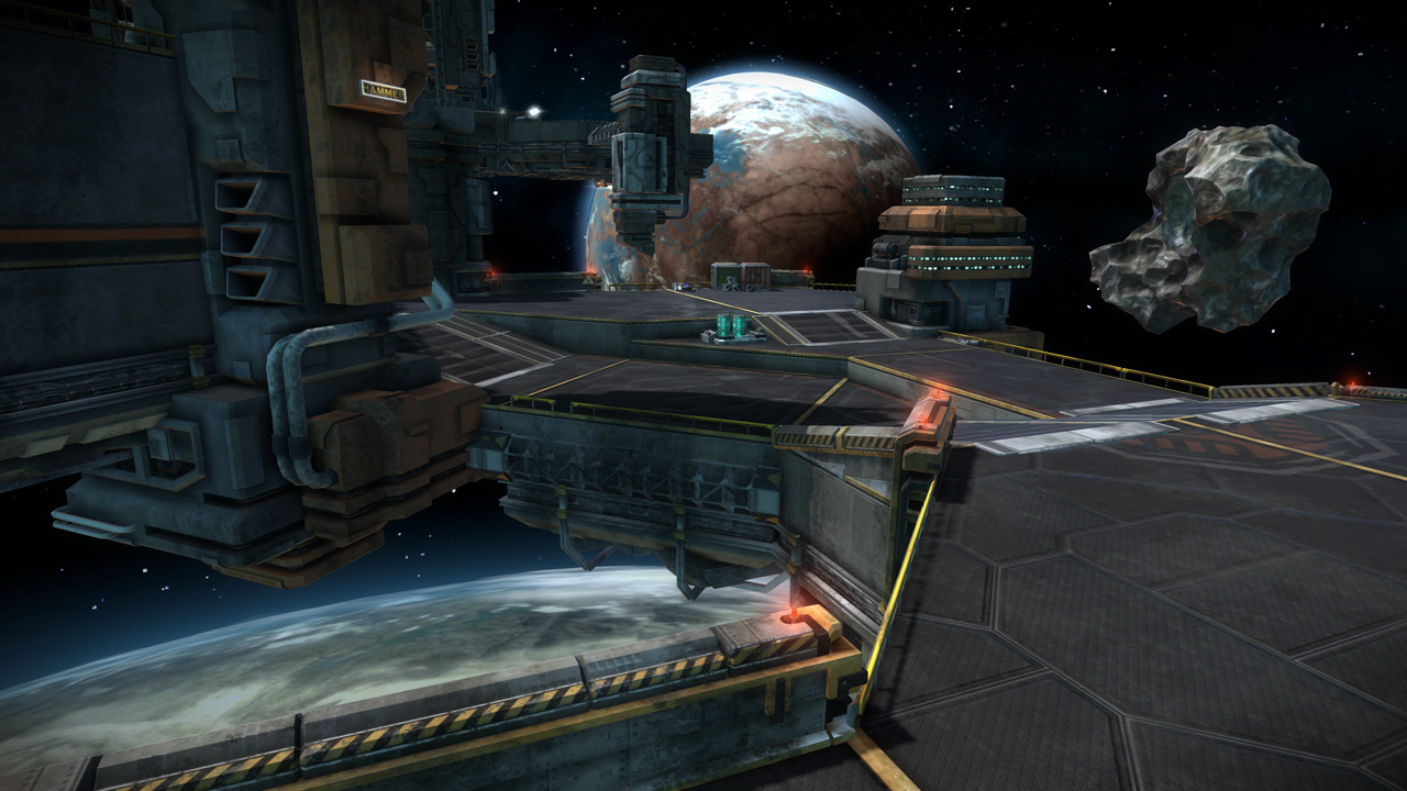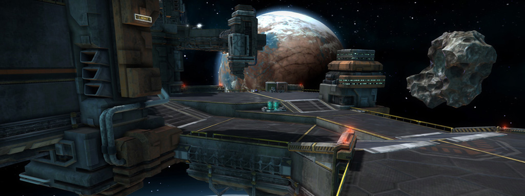 Starhawk's space levels were interesting beasts to construct. Unlike the terrestrial levels, which relied on terrain rendered in World Machine, our space levels were constructed from individually-placed platform meshes. This was a double-edged sword; editing and iteration became much easier without the need for tedious rendering and conversion, but were hell on object count and performance. This resulted in smaller, more compact layouts - the space levels ended up being the smallest levels in the shipping game.