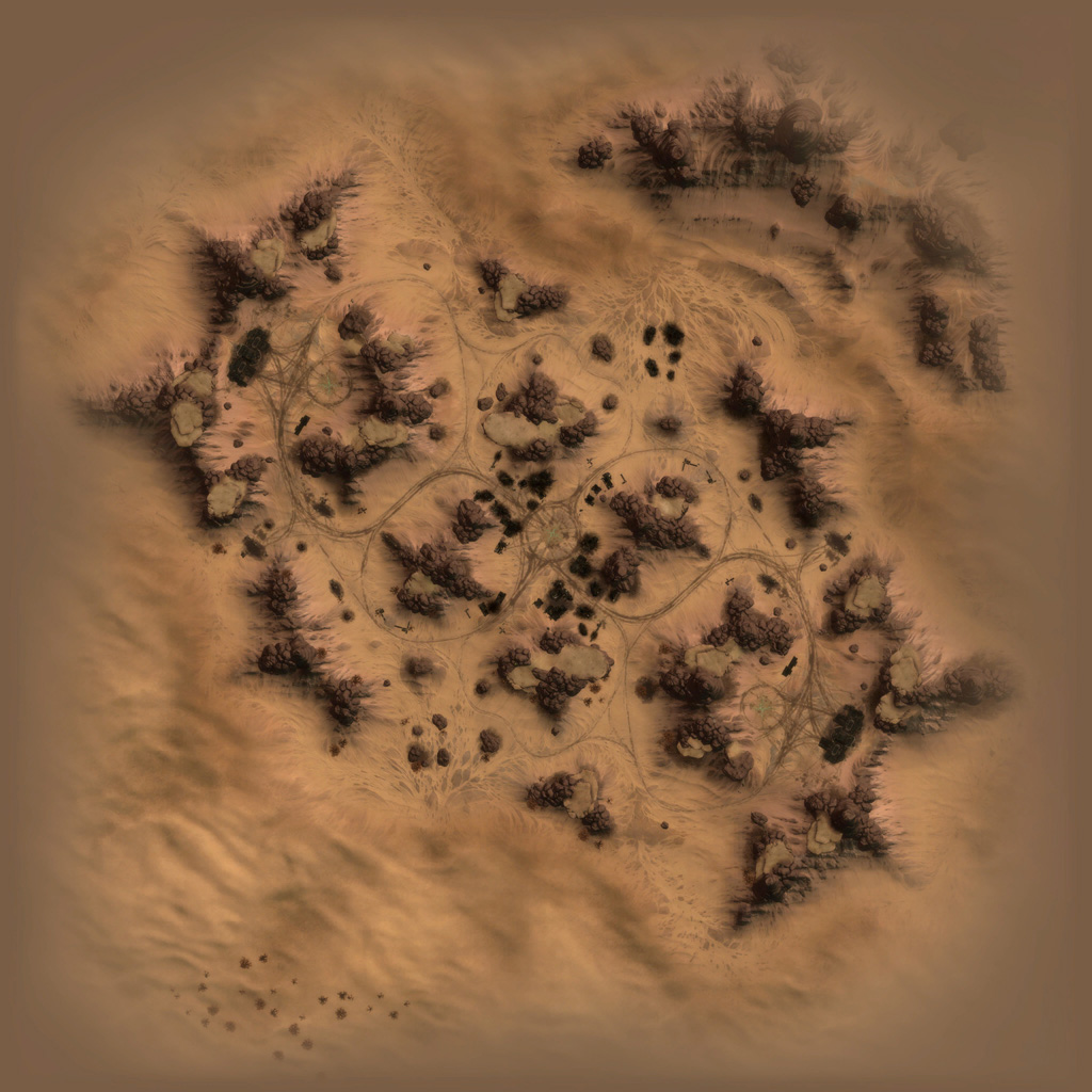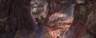 We went back and forth a bit on how to construct the terrain layout itself; I was able to work up a way to lay out large cracks in the terrain, which Jonny then fleshed out and detailed in the final terrain pass. This cracked look helped create Hollow's low-lying slot canyons as well as ramps allowing vehicles to jump over the gap in between.