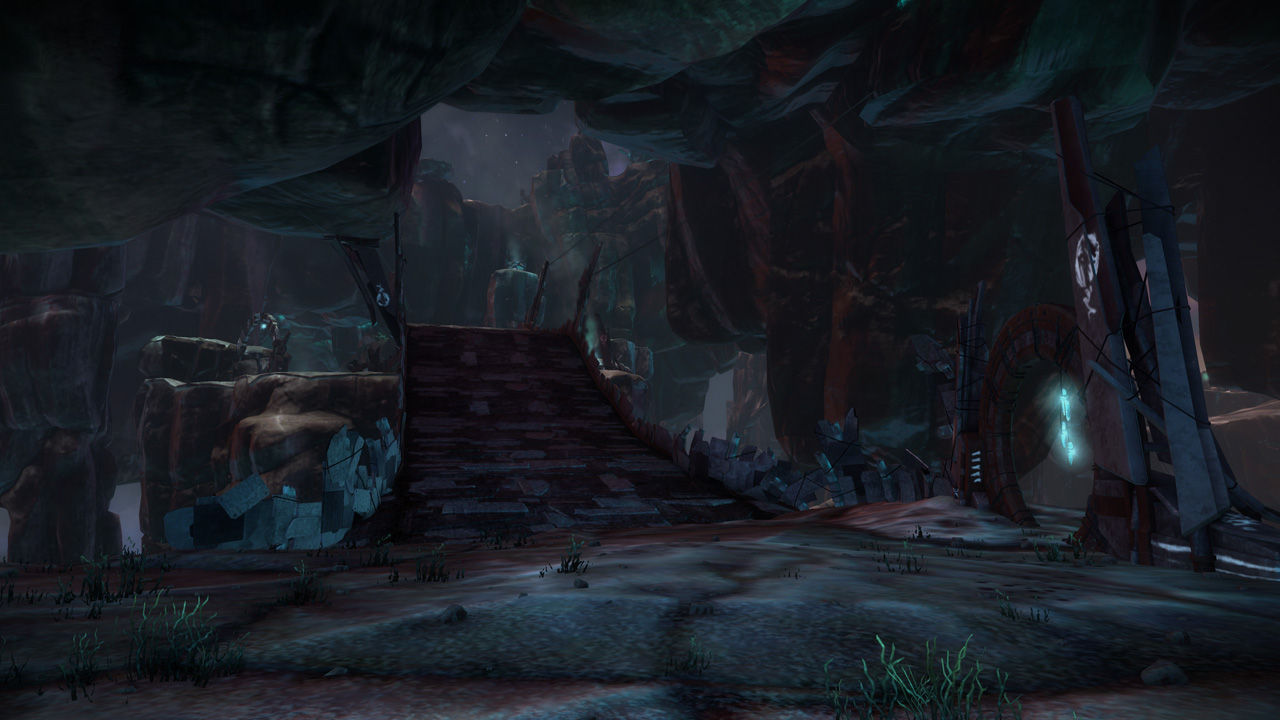 This was actually the second attempt at an Acid Sea-themed multiplayer level. The first was the layout that would eventually become Cove, which was deemed too large for sixteen-player servers in our unveil and early stages of the beta. Conduit's layout focuses around a large land mass with a central plateau, providing a key midground for CTF play. The side islands connected by bridges provide alternate routes (and additional rift locations for Zones).